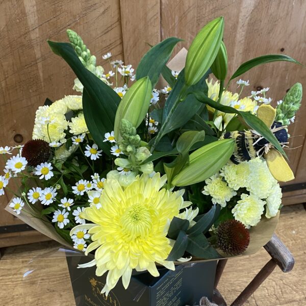 An aqua packed hand tied bumble bee themed bouquet in honey yellow tones finished in fully Biodegradable gift wrapping.