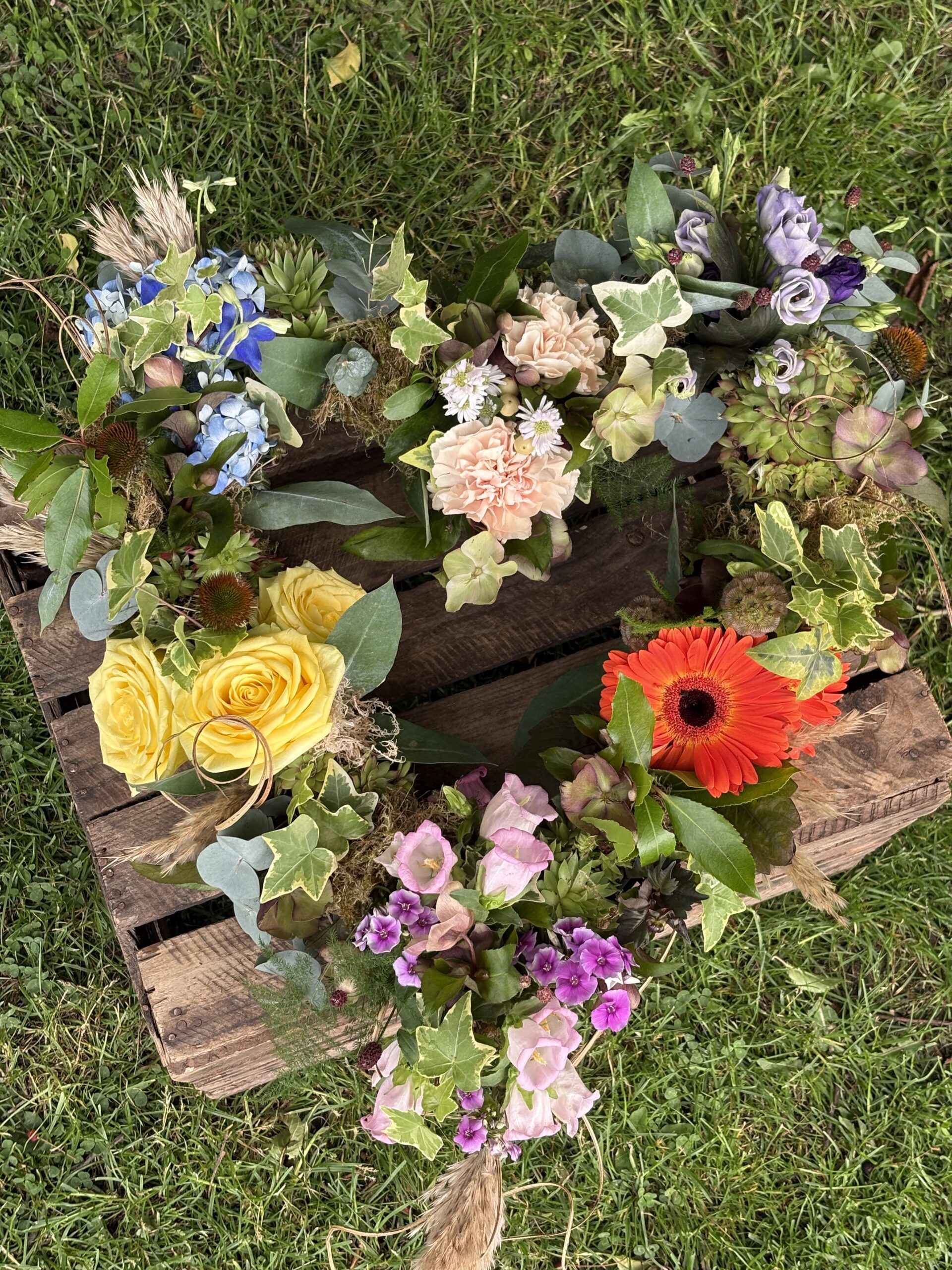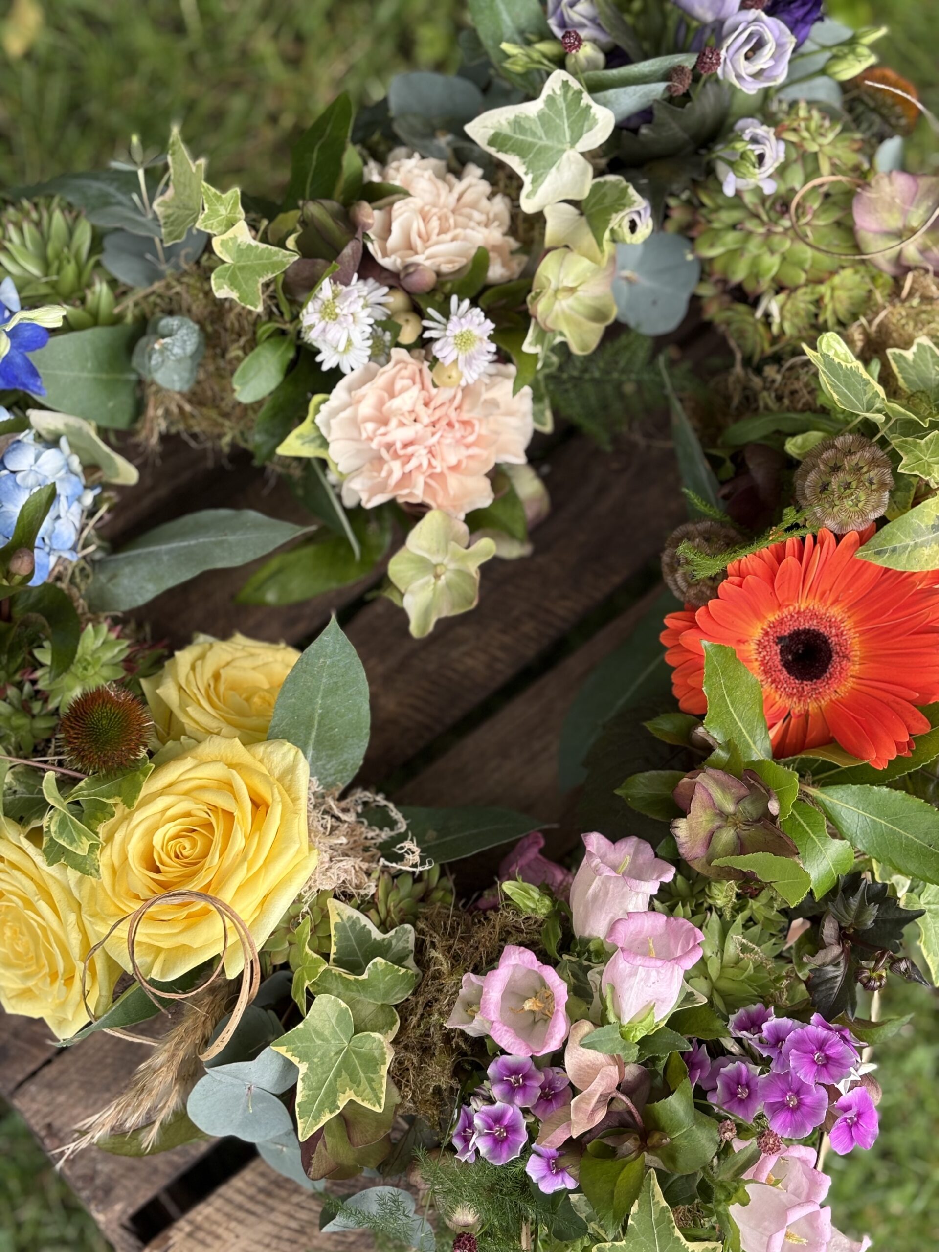 A beautiful combination of seasonal colourful flowers and garden plants for a textured natural look in the shape of a heart.